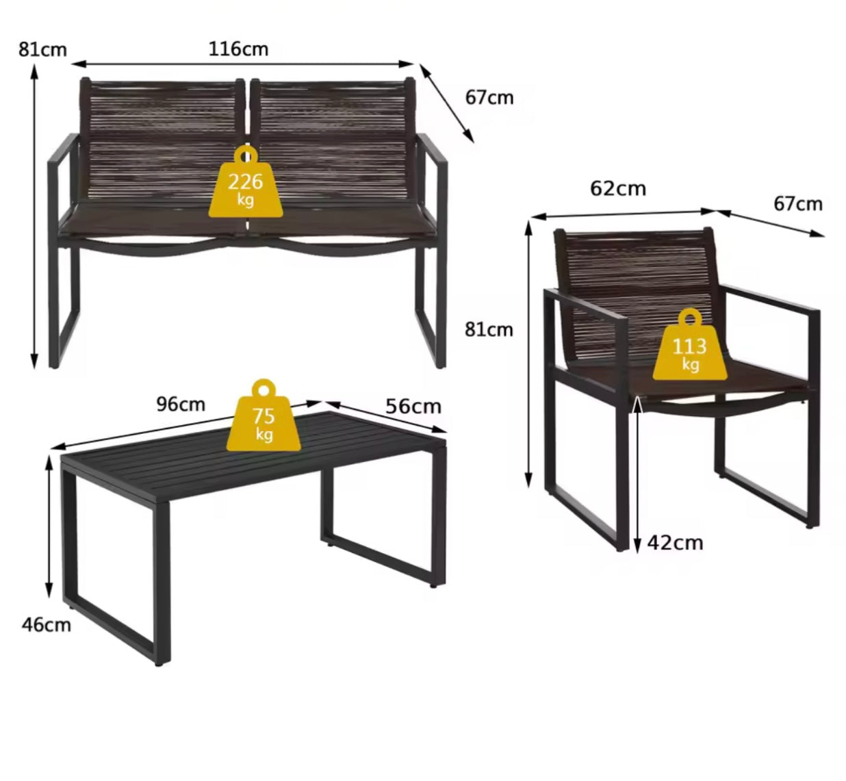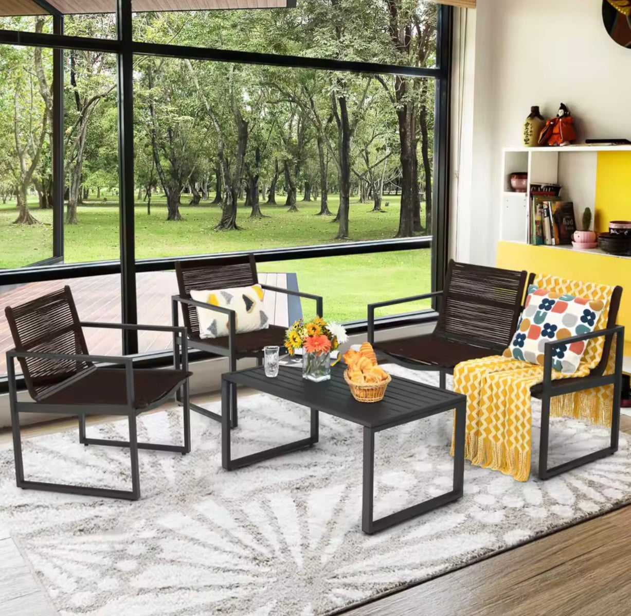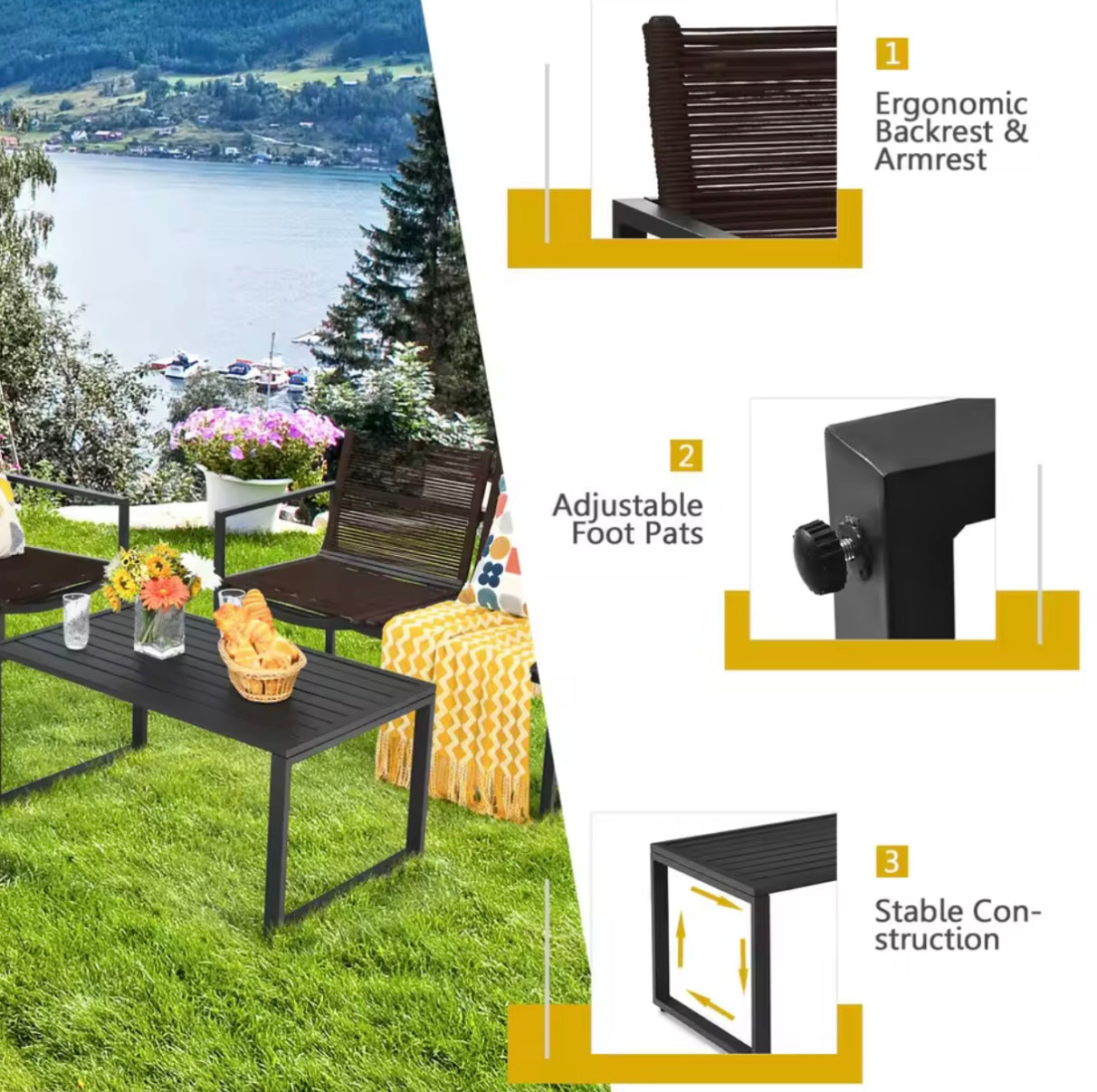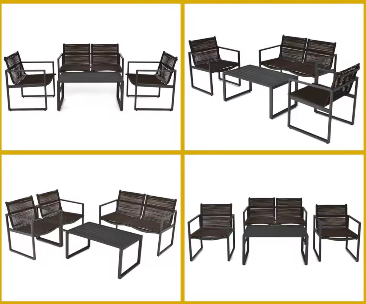 Unwind and relax in style with our 4-seat patio set, complete with a coffee table perfect for evening drinks. Enjoy outdoor living hassle-free with easy assembly and simple maintenance. Elevate your outdoor space and create memories with loved ones.