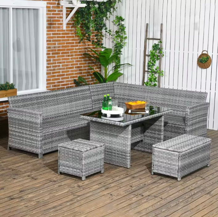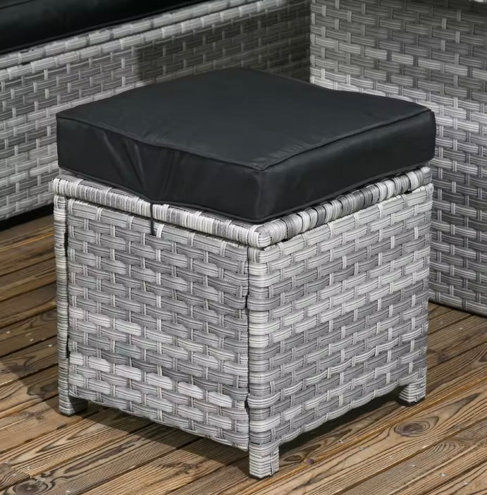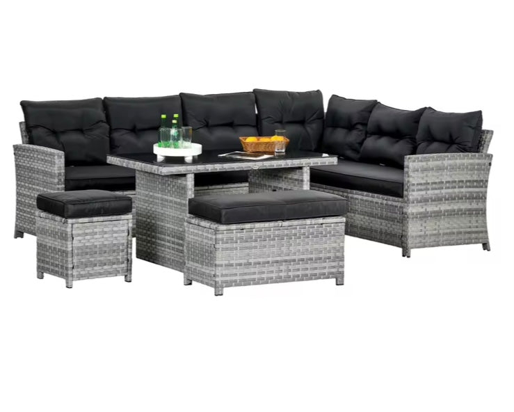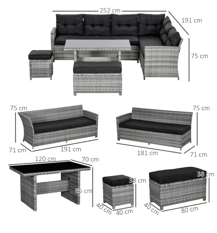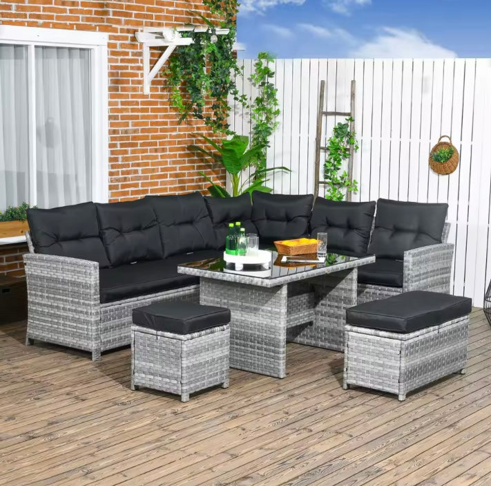 Create an inviting outdoor dining experience with our 9/10 Seater Outdoor Rattan Dining Set. Easy cushion removal makes cleaning a breeze, while the stylish grey rattan and luxurious black cushions add a touch of elegance to your outdoor living space. With enough seats for everyone, it's perfect for entertaining and enjoying quality time with family and friends!